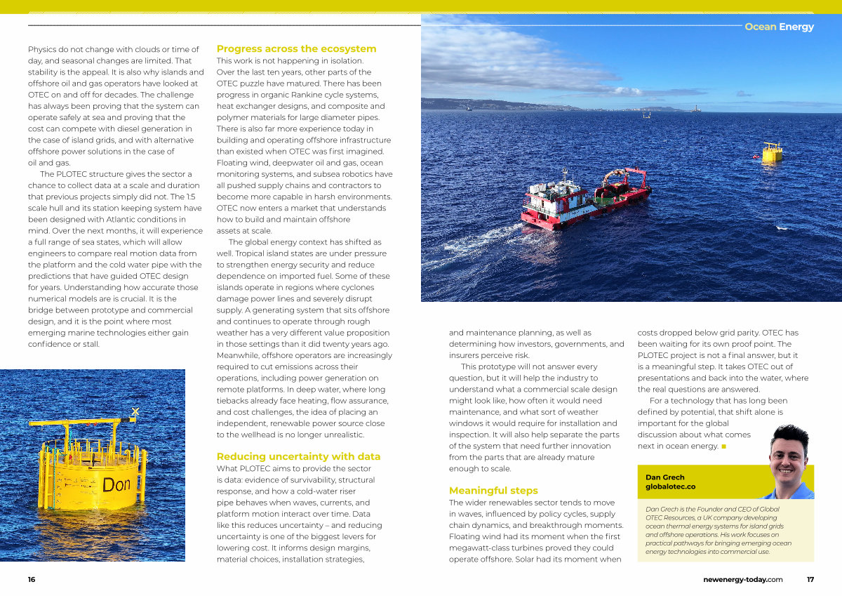 Dan Grech is the Founder and CEO of Global OTEC Resources, a UK company developing ocean thermal energy systems for island grids and offshore operations. His work focuses on practical pathways for bringing emerging ocean energy technologies into commercial use.