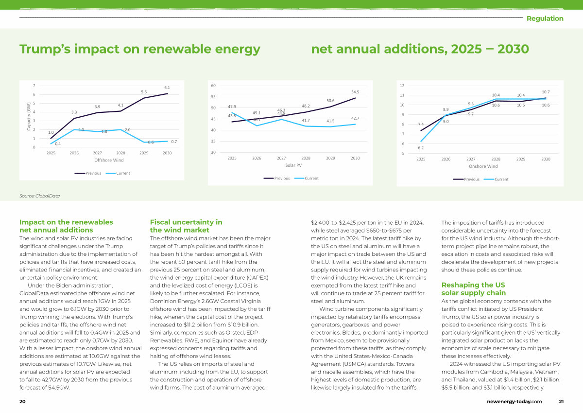 The offshore wind market has been the major target of Trump’ s policies and tariffs since it has been hit the hardest amongst all. With the recent 50 percent tariff hike from the previous 25 percent on steel and aluminum, the wind energy capital expenditure( CAPEX) and the levelized cost of energy( LCOE) is likely to be further escalated. For instance, Dominion Energy’ s 2.6GW Coastal Virginia offshore wind has been impacted by the tariff hike, wherein the capital cost of the project increased to $ 11.2 billion from $ 10.9 billion. Similarly, companies such as Orsted, EDP Renewables, RWE, and Equinor have already expressed concerns regarding tariffs and halting of offshore wind leases.