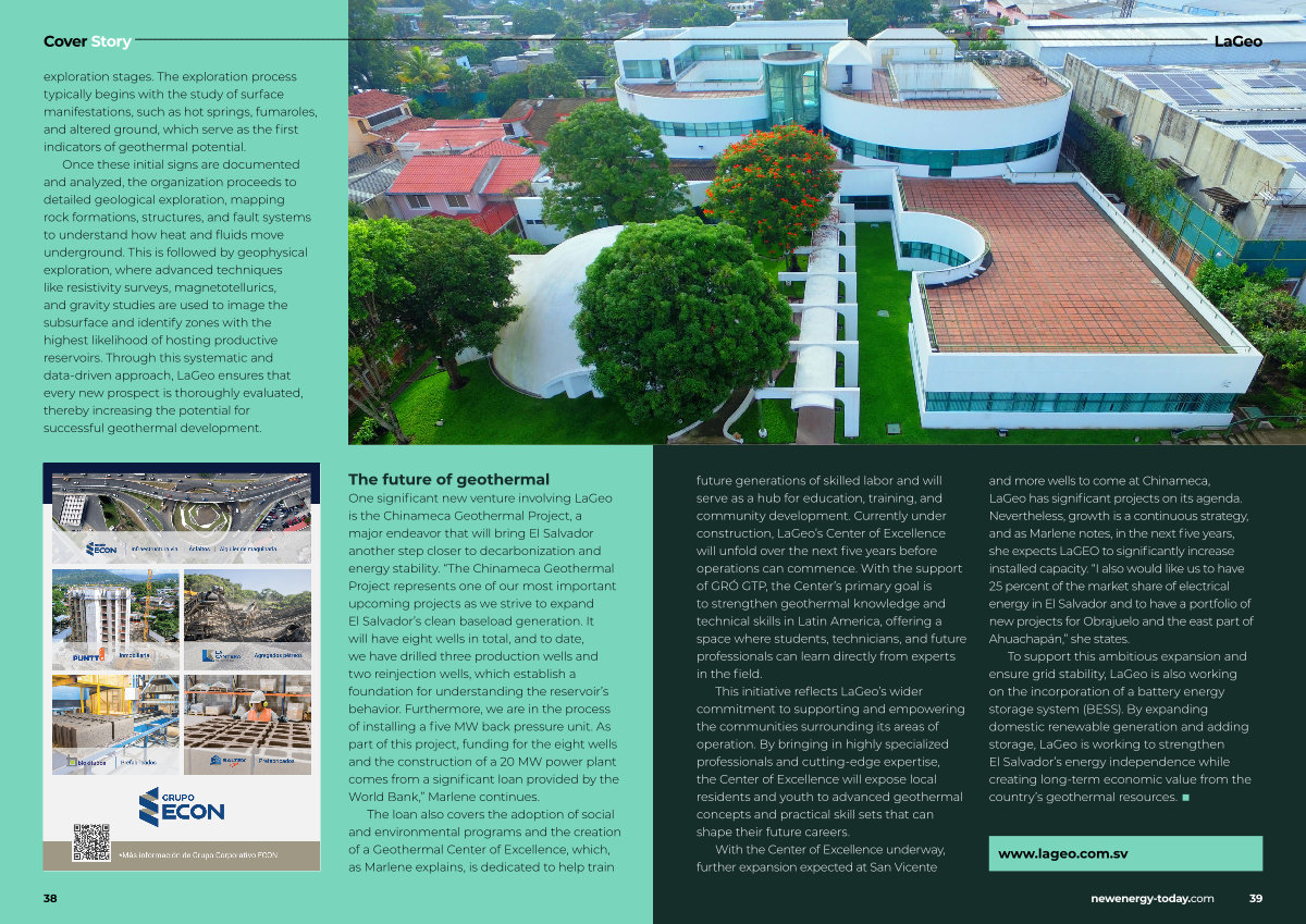 LaGeo future generations of skilled labor and will serve as a hub for education, training, and community development. Currently under construction, LaGeo’ s Center of Excellence will unfold over the next five years before operations can commence. With the support of GRÓ GTP, the Center’ s primary goal is to strengthen geothermal knowledge and technical skills in Latin America, offering a space where students, technicians, and future professionals can learn directly from experts in the field.